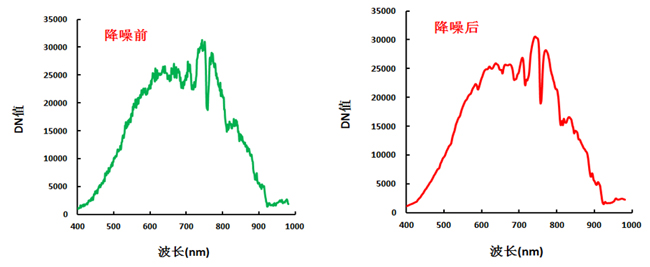 其次是噪聲去除,本文運(yùn)用國(guó)外較為常用的最小噪聲分離方法(Minimum Noise Fraction Rotation, MNF)進(jìn)行噪聲去除。最小噪聲分離工具用于判定圖像數(shù)據(jù)內(nèi)在的維數(shù)(即波段數(shù)),分離數(shù)據(jù)中的噪聲,減少隨后處理中的計(jì)算需求量。MNF本質(zhì)上是兩次層疊的主成分變換。第一次變換(基于估計(jì)的噪聲協(xié)方差矩陣)用于分離和重新調(diào)節(jié)數(shù)據(jù)中的噪聲,這步操作使變換后的噪聲數(shù)據(jù)只有最小的方差且沒有波段間的相關(guān)。第二步是對(duì)噪聲白化數(shù)據(jù)(Noise-whitened)的標(biāo)準(zhǔn)主成分變換。為了進(jìn)一步進(jìn)行波譜處理,通過檢查最終特征值和相關(guān)圖像來判定數(shù)據(jù)的內(nèi)在維數(shù)。數(shù)據(jù)空間可被分為兩部分:一部分與較大特征值和相對(duì)應(yīng)的特征圖像相關(guān),其余部分與近似相同的特征值以及噪聲占主導(dǎo)地位的圖像相關(guān)。由于此次采集的高光譜影像沒有白板校正,因此數(shù)據(jù)預(yù)處理的第一步輻射定標(biāo)沒有進(jìn)行分析處理,直接作MNF降噪分析。圖7為MNF降噪前后的成像高光譜數(shù)據(jù)中DN值的變化。