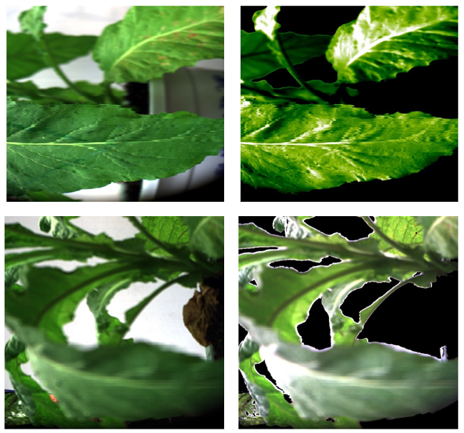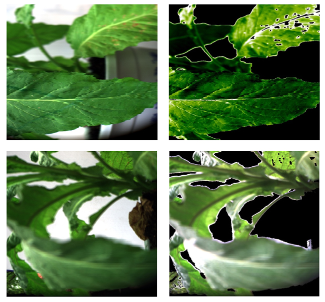 圖12 作物綠葉提取前后的圖像(去除葉片病害區(qū)域)
