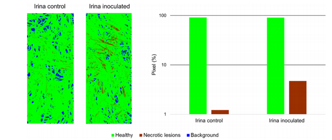 圖6 對照植株和接種植物的Mini-Plots上壞死病變的空間分布及像素比柱狀圖