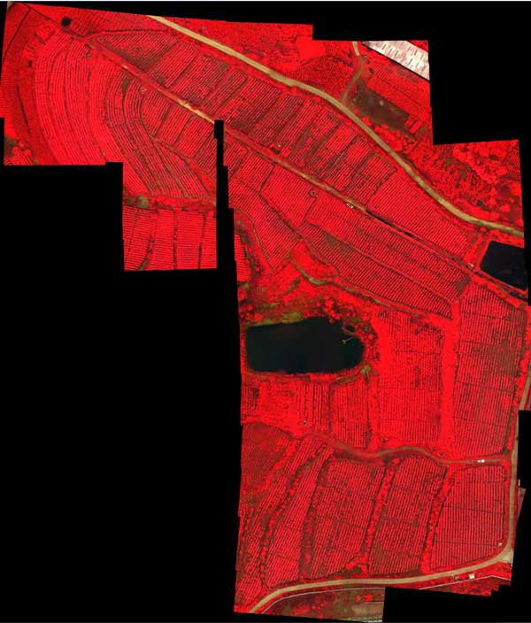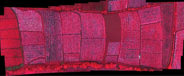 圖3為利用無人機(jī)高光譜拼接軟件HiSpectralStitcher對云南大理、楚雄、石林板橋鎮(zhèn)紅塔煙草(集團(tuán))有限責(zé)任公司的煙草試驗(yàn)基地的無人機(jī)高光譜影像的三波段拼接效果預(yù)覽圖(RGB分別代表750 nm/650 nm/550 nm最鄰近波長)。從拼接結(jié)果來看,除楚雄煙草試驗(yàn)基地,由于航線規(guī)劃過程沒規(guī)劃成功,導(dǎo)致部分煙草田塊沒有拼接成功外,大理和石橋板鎮(zhèn)煙草基地的無人機(jī)拼接結(jié)果較好。