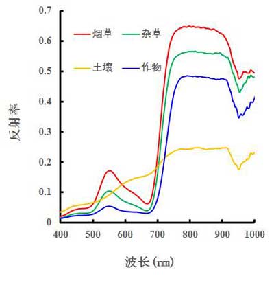 圖4為無人機(jī)高光譜影像上煙草、雜草、作物以及土壤在400-1000 nm范圍的光譜曲線。從圖中可知,煙草的光譜反射率高于雜草的光譜反射率,而雜草的光譜反射率則高于作物的光譜反射率,土壤的光譜反射率在400-760nm范圍內(nèi)保持穩(wěn)定上升的趨勢,在760-900nm范圍內(nèi)光譜差異不大,在900-1000nm范圍內(nèi)有一峰谷,這是因?yàn)樗盏脑颉?/span>
