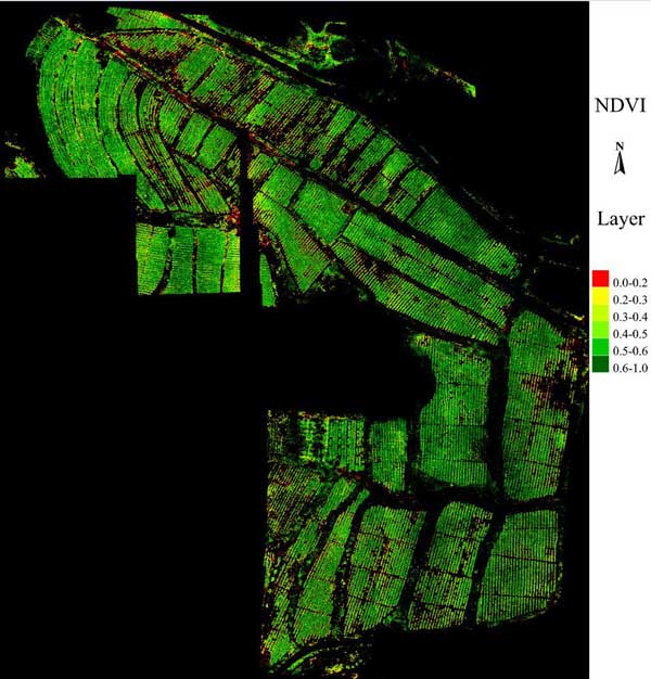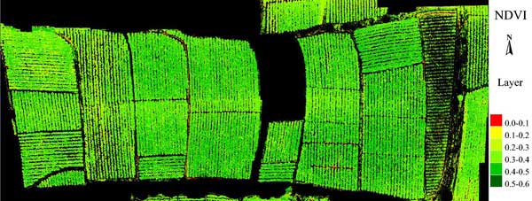 植被指數(shù)是一類具有一定生化意義的不同波段光譜值的組合,通常有比值植被指數(shù)、線性組合植被指數(shù)、修正植被指數(shù)、差值植被指數(shù)等。不同波段組合的植被指數(shù)對于不同指標(biāo)預(yù)測效果不同。在農(nóng)業(yè)上,基于光譜技術(shù)檢測作物生理指數(shù)的波段范圍一般在 400~2 500 nm 之間,涉及到色素(葉綠素、類胡蘿卜素等)、氮、水分等吸收和葉片細(xì)胞的內(nèi)部結(jié)構(gòu)。在 400-740 nm 可見光波段,葉綠素在 480、650、670-680、740 nm 處有吸收峰,類胡蘿卜素在420、425、440、450、470、480 nm 均有吸收峰,葉黃素在 425、445、475 nm 有吸收峰。而在 740-1 300 nm 近紅外波段由于健康的葉肉細(xì)胞反射作用,其反射率急劇升高;作物水分的吸收峰主要集中在 970、1 450、1 944 nm 處。因此當(dāng)作物受到脅迫作用時,相應(yīng)的氮、色素、酶等發(fā)生變化,通過應(yīng)用各種植被指數(shù)監(jiān)測這些生理指標(biāo)變化,可判斷作物脅迫情況、生長狀況以及產(chǎn)量情況。圖5為大理、楚雄、石板橋鎮(zhèn)煙草基地?zé)煵莸腘DVI分布圖(NDVI采用的綠光波長與紅光波長的),NDVI值越大則說明長勢越好。