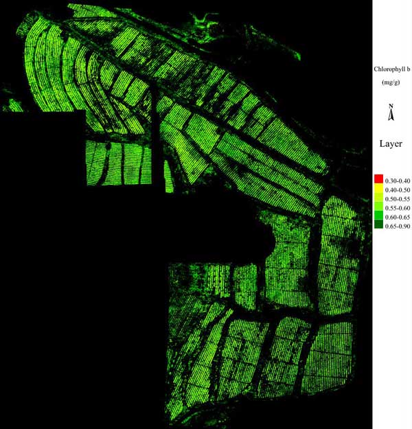 針對煙草葉綠素的監(jiān)測研究,本研究利用云南農(nóng)業(yè)大學(xué)研究的模型進(jìn)行反演,圖6分別對大理、楚雄和石板橋鎮(zhèn)煙草基地的煙草進(jìn)行葉綠素a和葉綠素b進(jìn)行反演。