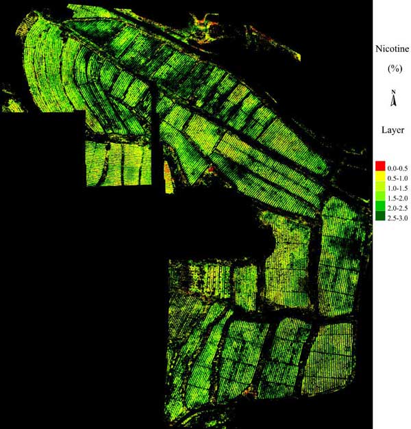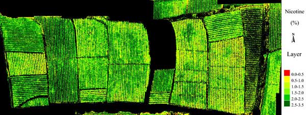 本文利用研究者利用光譜設(shè)備研究煙草觀察煙堿的模型反演到大尺度無人機(jī)高光譜影像上,從而分析得到每一田塊煙草煙堿的含量分布情況,如圖8所示。