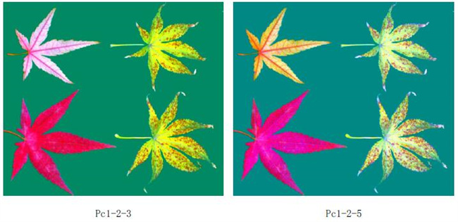 為了更客觀(guān)真實(shí)地識(shí)別出楓葉內(nèi)部品質(zhì)信息和不同變色期的差異,根據(jù)波段組合的特點(diǎn),對(duì)PCA前4個(gè)主成分組合成各種假彩色圖像,如圖5為楓葉的假彩色合成圖像。與灰度圖相比,假彩色合成更能直觀(guān)地識(shí)別出楓葉間的差異。