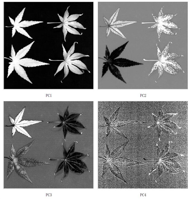 根據(jù)獲取的主成分圖像,第四主成分含有較多無(wú)用信息,說(shuō)明前4個(gè)主成分包含了大量的光譜信息。而前兩個(gè)主成分雖然包含了最多信息,且圖像較為清晰,在第二主成分可以明顯的看到紅楓葉病害區(qū)域。經(jīng)初步判斷,第二、三主成分結(jié)合實(shí)驗(yàn)室化學(xué)分析可以輕松的判斷出楓葉內(nèi)部成含量的變化以及分布情況。