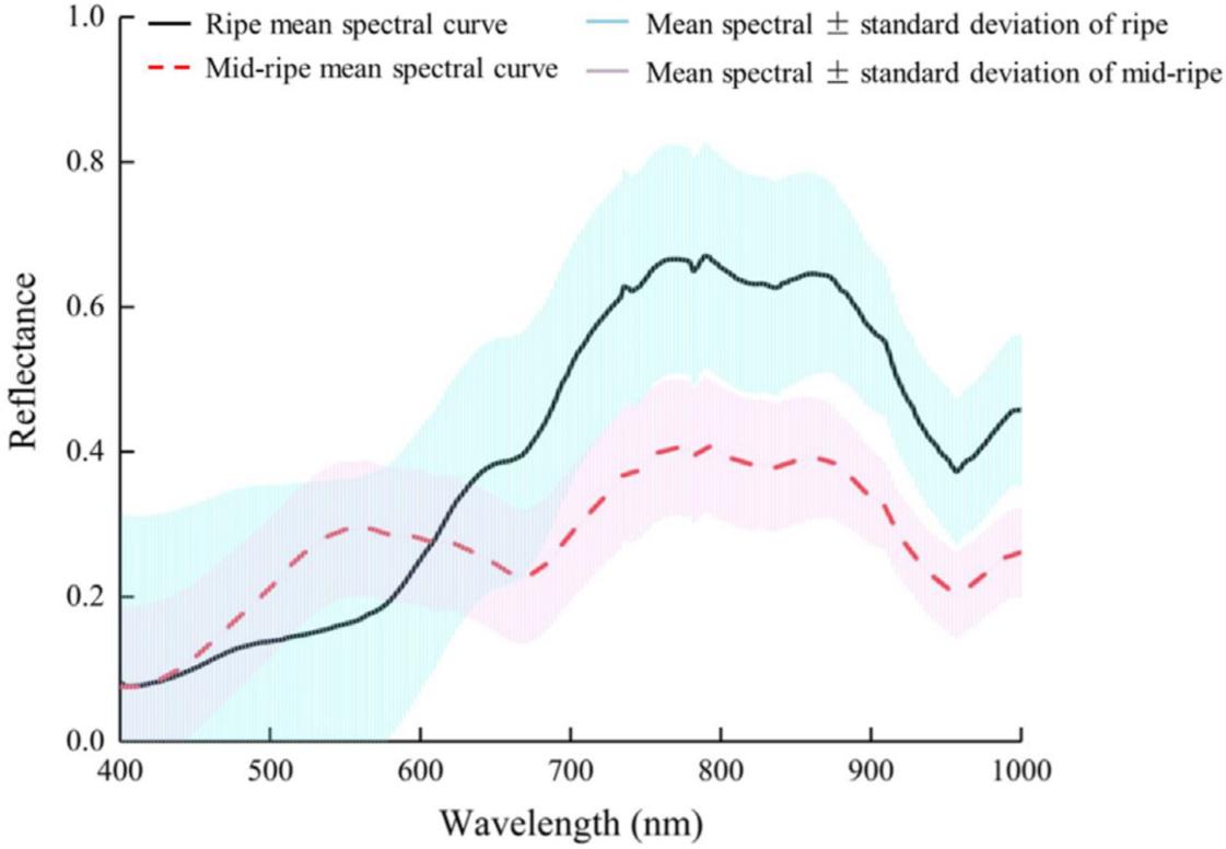 圖2 中熟和成熟的肥城桃子的平均光譜反射率與標(biāo)準(zhǔn)偏差