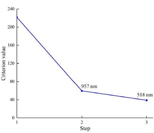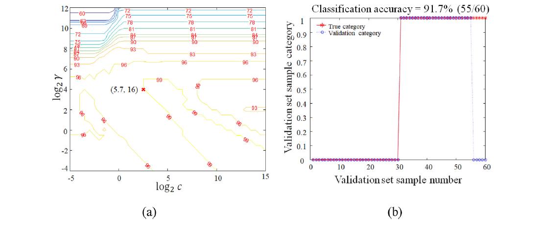在此基礎(chǔ)上,文章采用順序前向選擇(SFS)算法提取兩個(gè)有效波長(zhǎng)(957nm,518nm),如圖4所示。隨后使用LIBSVM模型對(duì)肥城桃子的成熟度進(jìn)行辨別,如圖5所示,圖5a為模型選取的最佳核參數(shù)C=5.7和γ=16,圖5b為模型分類識(shí)別的準(zhǔn)確率,分類識(shí)別精度達(dá)到91.7%。