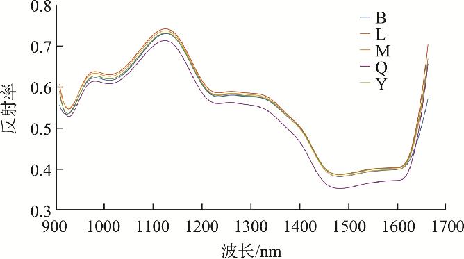 為顯示不同種類農(nóng)藥殘留高粱樣品光譜曲線的差異, 計算每類高粱樣品的光譜曲線的平均值得到平均光譜曲線, 如圖2所示。由圖2中可以看出, 在近紅外波段范圍內(nèi), 光譜曲線出現(xiàn)3處較為明顯的吸收峰, 分別位于925 nm、1230 nm、1470 nm左右。925 nm位置處的吸收峰與O-H的第一拉伸泛頻有關(guān), 1230 nm位置處的吸收峰與C-H的第二拉伸泛頻有關(guān), 1470 nm位置處的吸收峰與N-H的第一拉伸泛頻有關(guān)。在近紅外波段范圍內(nèi), 各類農(nóng)藥殘留高粱樣品的光譜反射率不同, 但總體變化趨勢相似。無農(nóng)藥殘留高粱樣品的反射率最低, 與不同類型農(nóng)藥殘留樣品的光譜曲線差異最明顯。此外, B與Y的平均光譜反射率非常接近, L的平均光譜反射率最高。在1000~1100 nm范圍內(nèi), 各類高粱樣品的反射率差距最大, 由高到低分別是L、M、Y、B、Q。這些平均光譜的差異為鑒別高粱樣品農(nóng)藥殘留種類提供了依據(jù)。