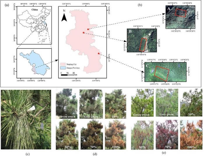 松樹樣樹來自江蘇省南京的城市森林帶,在三個選定的地點進行了兩次田間試驗。在三個地點對兩種松樹樣本樹進行了人工接種實驗,并使用地面非成像和無人機成像光譜儀定期收集高光譜數(shù)據(jù)。