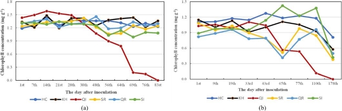 根據(jù)病木葉綠素濃度在感染過程中的變化比較,如圖1所示,健康對照黑松的葉綠素含量在整個測量期間保持穩(wěn)定。僅在接種后第178天的測量期間,觀察到葉綠素含量略有下降。然而,這種下降明顯小于在接種的松樹中觀察到的下降。這種小幅下降的主要原因是它與冬天的到來相吻合。然而,與黑松相比,馬尾松在衰退和恢復(fù)方面表現(xiàn)出更劇烈的變化,尤其是當(dāng)測量期延長到冬季時。這表明在SI、SR和QR感染狀態(tài)下樹種之間葉綠素含量變化的差異是顯著的。此外,季節(jié)性變化對葉綠素含量的影響也很明顯,特別是在受PWD感染的樹木中。