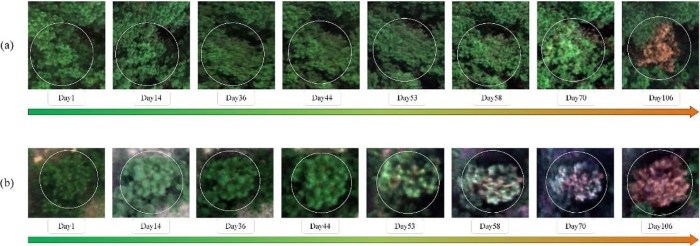 在站點C進行的無人機飛行實驗中,在接種黑松和馬尾松的樹木中,除了一棵保持健康的樹木外,其余三棵樹作為站點A和B表現(xiàn)出快速感染(QI)的癥狀。由于樹木中大部分癥狀變化始于樹冠中下部,因此從無人機圖像觀察時,樹冠頂部針葉的變色滯后。因此,在圖像上選擇樣本像素時,尤其是在可見癥狀變化期間,選擇將基于空中變色特征和地面觀測,以最大限度地減少冠層頂部新鮮樹葉的干擾。