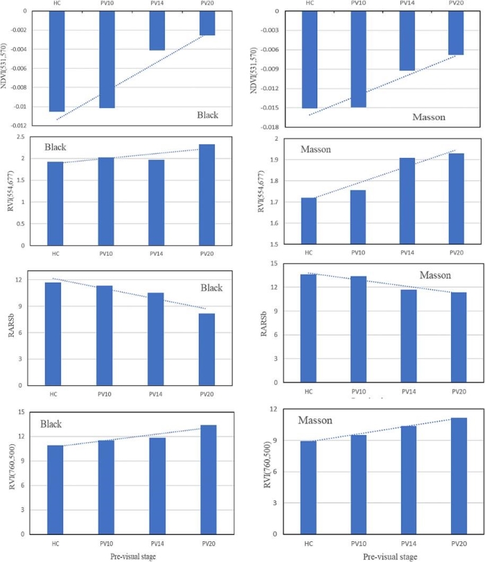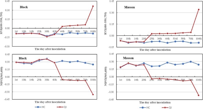 分析了自接種之日起RVI(680-550, 750)和NDVI(560, 680)的時間動態(tài),在疾病進展過程中,兩個指數(shù)的變化趨勢與非成像數(shù)據(jù)分析的結(jié)果一致。就兩個指數(shù)值的變化時間而言,馬尾松比黑松更快地進入視覺上可辨別的變色階段。這種疾病的進展與對接種樹木的實地調(diào)查結(jié)果一致。此外,與非成像數(shù)據(jù)分析的結(jié)果一致,這兩個指標(biāo)雖然表明區(qū)分了視覺前階段和視覺階段,但在視覺前階段,患病樹木和健康樹木之間的差異很小,使其不足以識別這一階段的患病樹木。