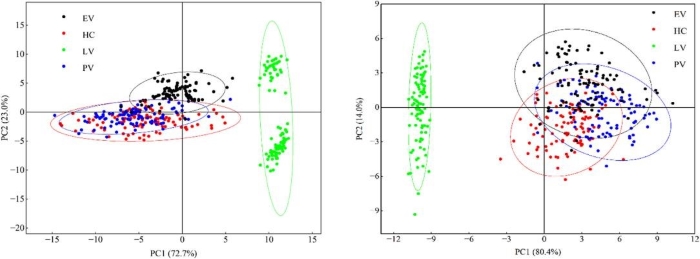 圖5 HC、PV、EV和LV階段的黑松(左)和馬尾松(右)的PCA-S評分圖