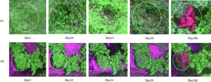圖7 馬尾松(a)和黑松(b)在侵染期(1、10、14、20和106)下的假彩色圖像接種后第二天)