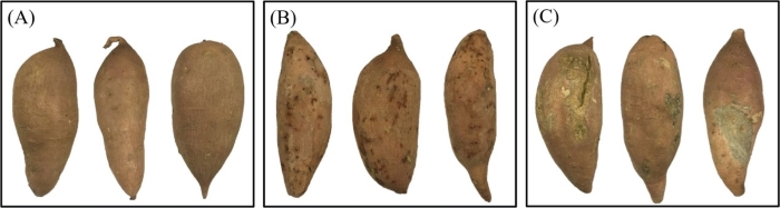 圖1. 三種類型的紅薯樣本:(A) 健康紅薯,(B) ***紅薯,(C) 患病紅薯