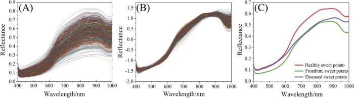圖3. 紅薯光譜曲線:(A) 原始光譜,(B) SNV預(yù)處理后的光譜,(C) 平均光譜