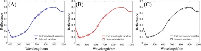 圖4. 通過(guò)(A) MCUVE,(B) RF和(C) SPA算法提取特征波長(zhǎng)