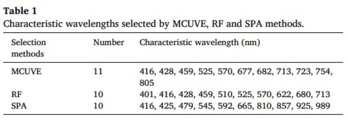 在使用全光譜進(jìn)行建模時(shí),高光譜圖像中的高維數(shù)據(jù)會(huì)受到某些波長(zhǎng)間相關(guān)性和冗余性的影響,這會(huì)增加計(jì)算量和建模難度。噪聲和無(wú)用信息也會(huì)影響模型的準(zhǔn)確性和魯棒性,不利于研究和實(shí)際應(yīng)用。因此,本研究采用蒙特卡羅無(wú)信息變量***法(MCUVE)、隨機(jī)森林(RF)和逐次投影法(SPA)三種波長(zhǎng)選擇方法。采用偏最小二乘判別分析(PLS-DA)和線性判別分析(LDA)兩種分類器建立了缺陷紅薯的分類模型。在PLSDA模型中,將健康紅薯、***紅薯和患病紅薯分別賦值為1、2和3的虛擬變量。以1.5和2.5作為判別閾值,如果模型預(yù)測(cè)值小于閾值T1 = 1.5,則判定為健康樣本。如果大于閾值T1 = 1.5且小于T2 = 2.5,則判定為***樣本。如果大于閾值T2 = 2.5,則判定為疾病樣本。