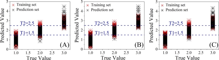 圖5. PLS-DA模型的訓(xùn)練和預(yù)測(cè)結(jié)果:(A) MCUVE-PLS-DA模型,(B) RF-PLS-DA模型,(C) SPA-PLS-DA模型