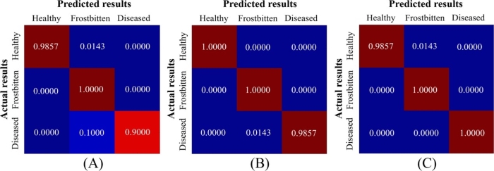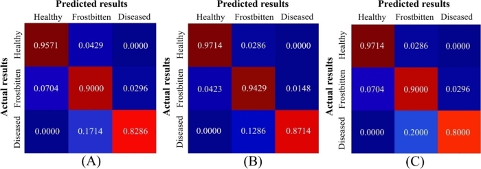 圖9. LDA模型的混淆矩陣:(A) MCUVE-LDA模型,(B) RF-LDA模型,(C) SPA-LDA模型