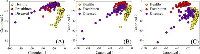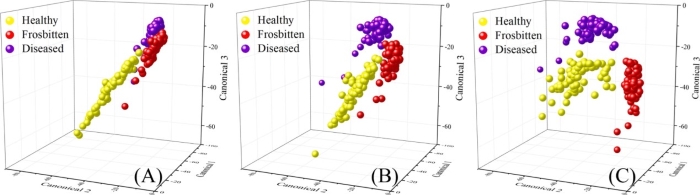 圖8. LDA模型三維散點(diǎn)圖:(A) MCUVE-LDA模型,(B) RF-LDA模型,(C) SPA-LDA模型