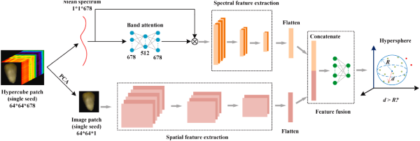 Zhang et al. (2024) 提出了一種基于高光譜成像和深度一類學(xué)習(xí)(OCL)的玉米種子欺詐檢測方法,旨在解決復(fù)雜開放場景下未知假品種的識別難題。通過融合高光譜數(shù)據(jù)的光譜與空間信息,結(jié)合波段注意力機(jī)制(BAM)抑制冗余波段干擾,構(gòu)建雙分支特征提取網(wǎng)絡(luò),并利用最小體積超球體學(xué)習(xí)策略實(shí)現(xiàn)真實(shí)品種的高效包裹與假品種的精準(zhǔn)拒絕。實(shí)驗(yàn)基于20個中國主栽玉米品種數(shù)據(jù)集,采用光譜(400.8-1000.7 nm)和降維后的單波段空間信息,模型在接收真實(shí)品種(ARK)和拒絕假品種(ARU)的準(zhǔn)確率分別達(dá)到93.70%和94.28%,AUC值為0.9399,顯著優(yōu)于傳統(tǒng)OCSVM、孤立森林及深度SVDD等方法。該方法通過端到端網(wǎng)絡(luò)架構(gòu)避免了復(fù)雜光譜預(yù)處理,結(jié)合信息融合與注意力機(jī)制提升了模型的穩(wěn)定性和解釋性,為種子質(zhì)量監(jiān)管及農(nóng)產(chǎn)品防偽提供了高效、無損的解決方案。