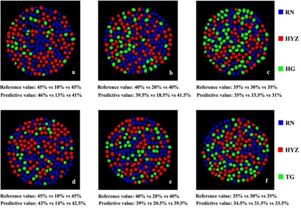 Huang et al. (2022) 該研究結(jié)合近紅外高光譜成像(HSI)與深度森林(DF)模型,開發(fā)了一種快速無損測定高粱純度的方法。通過孤立森林算法(IF)和主成分分析(PCA)剔除異常數(shù)據(jù)后,采用競爭性自適應(yīng)重加權(quán)采樣(CARS)與連續(xù)投影算法(SPA)提取特征波長,并結(jié)合灰度共生矩陣(GLCM)獲取紋理特征?;诓煌瑪?shù)據(jù)類型(全光譜、特征光譜、紋理特征及融合數(shù)據(jù))構(gòu)建的DF模型中,特征光譜模型的性能最優(yōu),其平均正確識別率(CRR)超過91%,驗(yàn)證集I的平均CRR為88.89%。此外,模型在摻假比例檢測中預(yù)測偏差小于4%。研究證實(shí),HSI與DF的結(jié)合能夠高效區(qū)分高粱品種并精準(zhǔn)評估純度,為谷物質(zhì)量的無損檢測提供了新策略。高粱摻雜識別可視化如圖11所示。