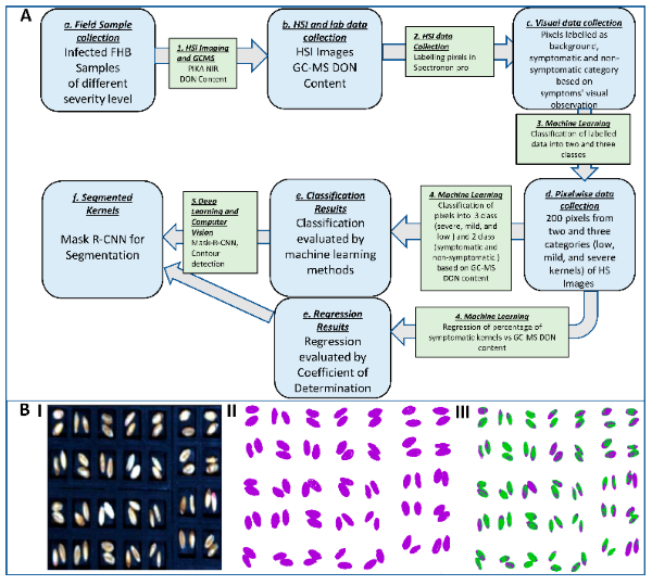 Dhakal et al. (2023) 基于高光譜成像(HSI)與機(jī)器學(xué)習(xí)方法,提出了一種小麥籽粒赤霉?。‵HB)損傷及其毒素脫氧雪腐鐮刀菌烯醇(DON)含量的無損檢測技術(shù)。通過對129個小麥品種的田間試驗(yàn)樣本(DON含量通過GC-MS測定)進(jìn)行高光譜數(shù)據(jù)采集,結(jié)合集成學(xué)習(xí)算法G-Boost和深度學(xué)習(xí)模型Mask R-CNN,實(shí)現(xiàn)了小麥籽粒損傷分類與DON含量的關(guān)聯(lián)分析(圖15)。結(jié)果表明,G-Boost在光譜特征分類中表現(xiàn)最優(yōu),訓(xùn)練集準(zhǔn)確率達(dá)97%,可有效區(qū)分健康、低DON(<0.5 ppm)與高DON(>1.5 ppm)籽粒;Mask R-CNN在實(shí)例分割中平均精度(mAP)達(dá)0.97,結(jié)合閾值法(70%病斑像素判定為病粒)后,DON含量與病粒數(shù)量回歸分析的決定系數(shù)(R²)提升至0.75。該研究驗(yàn)證了高光譜成像結(jié)合多模態(tài)機(jī)器學(xué)習(xí)模型在農(nóng)業(yè)毒素在線檢測中的潛力,為糧食加工環(huán)節(jié)的快速質(zhì)量評估提供了技術(shù)參考。