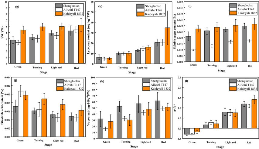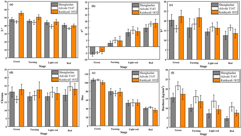 在番茄的品質(zhì)檢測中,大多數(shù)檢測是針對單一品質(zhì)指標(biāo),很少能同時檢測番茄的綜合品質(zhì)。本研究為尋找可表示番茄綜合品質(zhì)的指標(biāo),采用可見光和近紅外(Vis-NIR)高光譜成像技術(shù),分別在綠熟期、轉(zhuǎn)色期、成熟期和晚熟期,對3個常栽番茄品種(‘圣羅蘭’、‘凱德雅麗1832’和‘愛綠士T147’)的果實進行了圖像采集,并測定了其中的12個品質(zhì)指標(biāo):果實的顏色指標(biāo)(L*、a*、b*、色度值、色調(diào)值、a*/b*)、硬度、番茄紅素、可溶性固形物、可溶性糖、有機酸和VC含量作為參考標(biāo)準(zhǔn)。