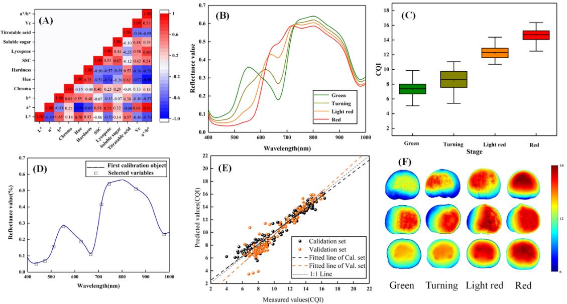 最后通過連續(xù)投影算法選擇特征波長,用于建立CQI預(yù)測的三個回歸模型。結(jié)果表明,多元線性回歸(MLR)模型RV2= 0.87,RMSEV = 1.33,RPD = 2.58取得了良好的性能。本研究表明,基于高光譜成像和化學(xué)計量學(xué)技術(shù),可以無損預(yù)測番茄的綜合品質(zhì),為番茄果實的最佳采收期的確定、果實分級、運輸、貯藏和保鮮提供了技術(shù)支持。本研究提出的綜合品質(zhì)指標(biāo)(CQI)不僅綜合了番茄果實的內(nèi)外部品質(zhì)指標(biāo),而且與番茄的成熟度具有一定的關(guān)聯(lián)性。