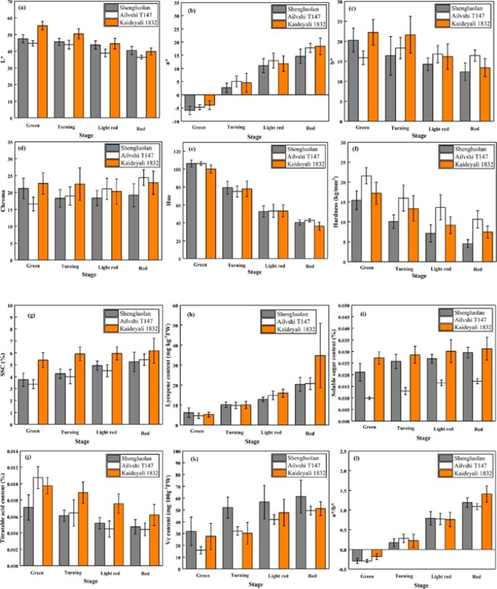 圖1 番茄品質(zhì)指標(biāo)的變化:(a)L*;(b)a*;(c)b*;(d)色度;(e)色調(diào);(f)硬度;(g)SSC;(h)番茄紅素含量;(i)可溶性糖含量;(j)可滴定酸含量;(k)VC含量;(L)a*/b*。