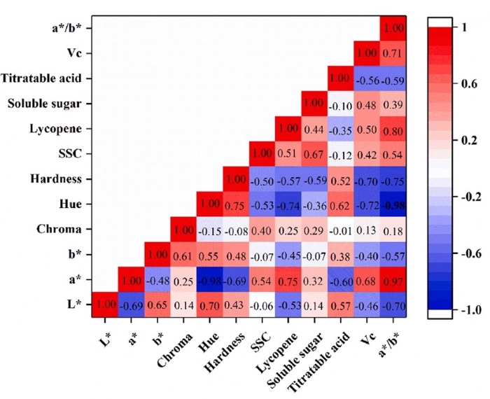 在采集光譜后,使用色差計測量色差值(L*,a*,b*,色度、色調(diào))。數(shù)字水果硬度測試儀被用來測量西紅柿的硬度。用榨汁機研磨并提取過濾番茄果肉,將所得番茄汁滴在ATAGOBrix計的棱鏡板上,測量可溶性固溶體含量(SSC)。以無水乙醇、無水甲醇、石油醚和2%二氯甲烷為萃取劑,從未過濾的全番茄醬中提取番茄紅素。利用蒽酮硫酸比色法測定可溶性糖,堿性滴定法測定可滴定酸。采用2,6-二氯吲哚酚滴定法測定維生素C含量。