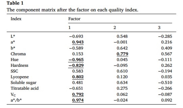 最后,為了更好地解釋質(zhì)量指標(biāo)與前三個因子的關(guān)系,通過因子分析得到了載荷值(表1)。這表明每個指標(biāo)在前三個因子中的重要性。第一個因子主要反映了a*值、色調(diào)、硬度、番茄紅素、a*/b*值和維生素C的質(zhì)量特性,這些指標(biāo)的絕對值較大。色度在第二個因子中具有最大的正載荷權(quán)重,發(fā)揮了決定性的作用。相比之下,在第三個因子中沒有任何一個指標(biāo)占據(jù)主導(dǎo)地位。通過因子分析后,選擇了七個主要指標(biāo)用于番茄綜合評價,包括a*值、色度、色調(diào)、硬度、番茄紅素、維生素C和a*/b*值。正負載荷值分別分配給分子和分母,進而提出了一個綜合質(zhì)量指數(shù)(CQI)。