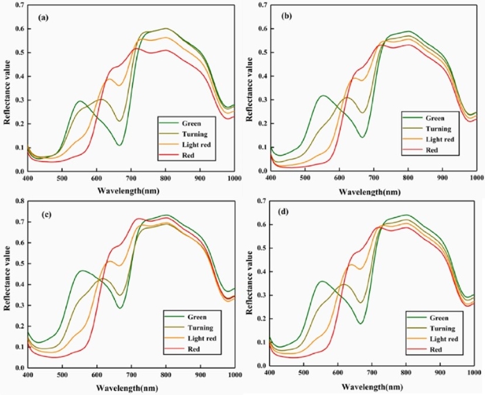 圖3 番茄在綠色、混色、淡紅色和紅色時的平均光譜曲線。(a)‘Shengluolan’;(b)‘AilvshiT147’;(c)‘Kaideyali1832’;(d)三個品種的混合平均光譜
