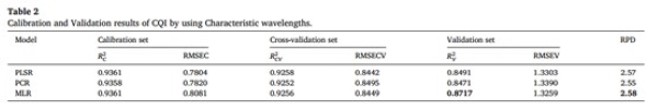 基于綜合質(zhì)量指數(shù)(CQI)和特征波長,分別建立了PLSR、PCR和MLR的綜合質(zhì)量預(yù)測模型。表2顯示了PLSR、PCR和MLR模型的校準、交叉驗證和驗證性能。各模型均獲得了滿意的性能,R2C接近于1,RPD大于2.5。比較R2V和RMSEV的值,MLR的預(yù)測效果最好,R2V=0.87,RMSEV=1.33,RPD=2.58。本研究提出的新質(zhì)量指標(biāo)(CQI)考慮了更多的質(zhì)量信息,可以應(yīng)用于水果的綜合評價。結(jié)果表明,利用高光譜成像技術(shù)對番茄品質(zhì)進行無損預(yù)測,對番茄高效栽培和采收具有重要的指導(dǎo)意義。