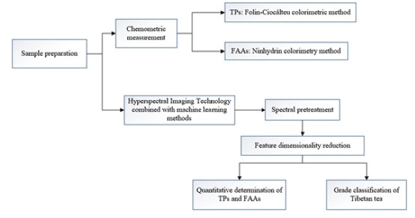 Hu等(Hu et al., 2023)采用高光譜成像技術(shù)結(jié)合化學計量學測定了藏茶中TPs和FAAs含量,并對藏茶的品級進行了區(qū)分,展示了預處理和機器學習方法結(jié)合使用在預測茶葉品質(zhì)方面的高效性,流程圖如圖6所示。證實了高光譜成像技術(shù)(HSI)作為一種快速、無損的茶葉質(zhì)量檢測方法的潛力,為茶葉質(zhì)量控制和品級評定提供了一種有效的技術(shù)手段。