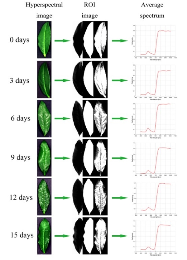 圖8. 不同干旱脅迫下的茶葉高光譜圖像處理及光譜提取流程