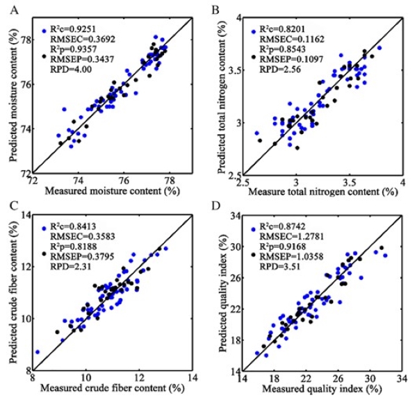 Wang等(Wang et al., 2020)以采后茶葉鮮 葉為研究對象,探討了328~1115 nm高光譜成像快速預測鮮葉水分、總氮、粗纖維含量和品質(zhì)指標值的潛力,評價結(jié)果如圖10所示。研究結(jié)果為多光譜成像系統(tǒng)的進一步在線應用提供了基礎。