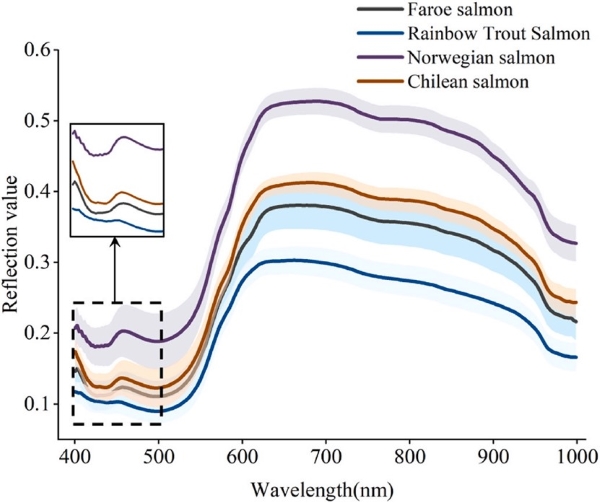 此外,還識(shí)別出幾個(gè)與不同官能團(tuán)相對(duì)應(yīng)的常見(jiàn)吸收峰。在可見(jiàn)光至近紅外光譜范圍(400-1000 nm)內(nèi),光譜顯示出明顯的峰值和谷值,觀察到的吸收信息主要與樣本中有機(jī)大分子官能團(tuán)的基本振動(dòng)相關(guān)(例如,C-H、N-H、O-H和S-H)。在可見(jiàn)光區(qū)域(400-760 nm),在450 nm左右觀察到一個(gè)顯著的吸收峰,歸因于肌紅蛋白和總色素的吸收。在650-700 nm,觀察到高反射率,反映了三文魚(yú)的紅色光譜特征。在近紅外區(qū)域(700-1000 nm),在760 nm出現(xiàn)吸收峰,對(duì)應(yīng)于O-H伸縮振動(dòng)的第三泛音。此外,在980 nm觀察到輕微的下降,對(duì)應(yīng)于O-H伸縮振動(dòng)的第二泛音。這些觀察表明,樣本中光譜反射率的變化可以歸因于它們化學(xué)性質(zhì)的變化。換句話說(shuō),不同品種的三文魚(yú)由于化學(xué)性質(zhì)的差異而表現(xiàn)出不同的反射率??傊?,400-1000 nm可以表征三文魚(yú)肉質(zhì)的特性,為后續(xù)三文魚(yú)來(lái)源的追溯提供了理論基礎(chǔ)。