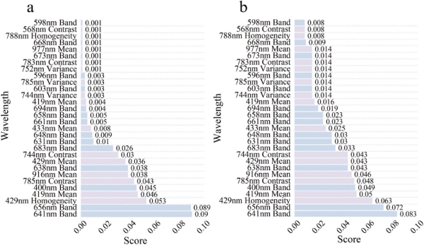 在全波段建模計(jì)算中,LGB和GBDT模型始終產(chǎn)生最穩(wěn)定的結(jié)果。因此,本研究?jī)H通過(guò)LGB和GBDT模型選擇重要波長(zhǎng)進(jìn)行分類(lèi)。LGB和GBDT算法被用來(lái)對(duì)光譜和紋理融合模型的2133個(gè)變量進(jìn)行特征選擇,每個(gè)算法提取的前30個(gè)貢獻(xiàn)最大的特征變量被分別用于分析(見(jiàn)圖2)。對(duì)特征變量重要性的分析顯示,兩個(gè)模型的光譜特征變量更集中于650 nm,而紋理特征更集中于400-450 nm和700-800 nm的單波段灰度圖像。特別值得注意的是,在640-670 nm的光譜區(qū)域觀察到最高的貢獻(xiàn)率。從圖1可以看出,這些光譜區(qū)域主要與色素、蛋白質(zhì)和水分有關(guān),導(dǎo)致三文魚(yú)片中高反射率,并突出了三文魚(yú)的光譜特性。