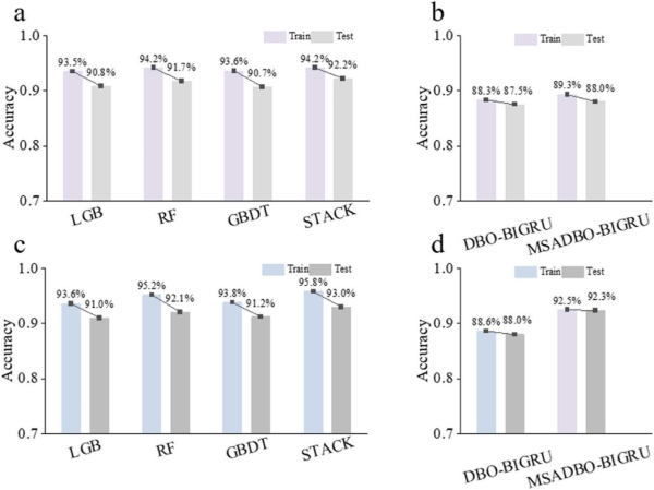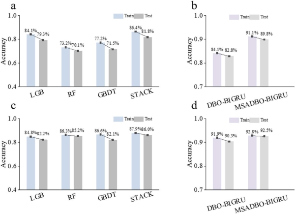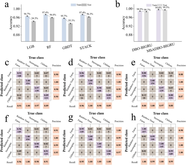 圖5.融合模型的建模結(jié)果:(a)ML算法的融合建模結(jié)果;(b)深度學(xué)習(xí)算法的融合建模結(jié)果;(c)LGB的混淆矩陣;(d)RF的混淆矩陣;(e)GBDT的混淆矩陣;(f)STACK的混淆矩陣;(g)DBO-CNN-BiGRU的混淆矩陣;(h)MSADBO-CNN-BiGRU的混淆矩陣