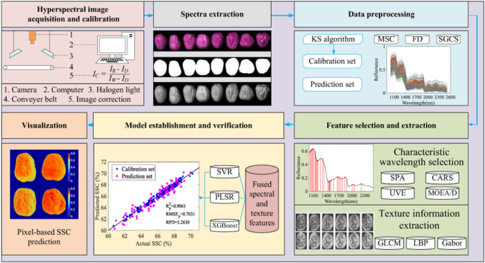 (Wei et al., 2024)提出一種結(jié)合高光譜成像技術(shù)和光譜紋理特征融合的方法,用于估算和田棗的可溶性固形物含量(SSC)。采用了HySpex系列高光譜成像儀(Norsk Elektro Optikk A/S),其波長(zhǎng)范圍為1003.22–2512.97 nm,掃描獲取了紅棗樣本的高光譜數(shù)據(jù)。在特征提取方面,研究結(jié)合了灰度共生矩陣(GLCM)、局部二值模式(LBP)與Gabor濾波器三種圖像紋理特征提取方法,進(jìn)一步增強(qiáng)了空間信息。采用MOEA/D算法進(jìn)行特征波長(zhǎng)選擇,減少了光譜冗余,并提高了預(yù)測(cè)精度。研究使用了XGBoost集成學(xué)習(xí)模型進(jìn)行SSC預(yù)測(cè)。與傳統(tǒng)的單純光譜特征模型相比,融合了空間紋理特征的模型在準(zhǔn)確性上表現(xiàn)更優(yōu),預(yù)測(cè)決定系數(shù)(R²)達(dá)到0.9061,均方根誤差(RMSEP)為0.7031,殘差預(yù)測(cè)偏差(RPD)為3.2630,明顯優(yōu)于單一光譜信息的預(yù)測(cè)結(jié)果。此外,研究還通過(guò)MOEA/D算法選擇的光譜波長(zhǎng)(31個(gè)波長(zhǎng))提供了較高的預(yù)測(cè)性能,相較于傳統(tǒng)的SPA、CARS和UVE方法,表現(xiàn)出更好的靈活性和預(yù)測(cè)精度。