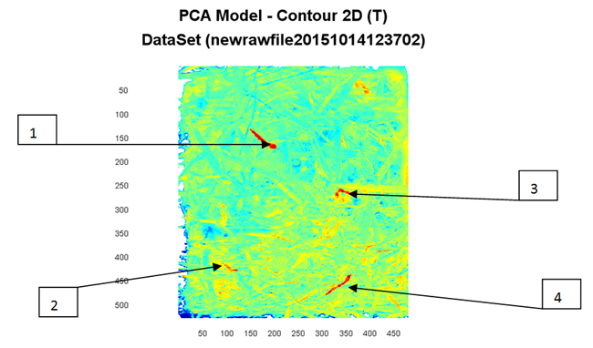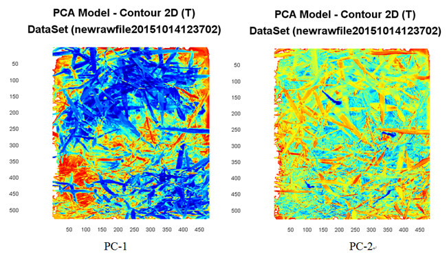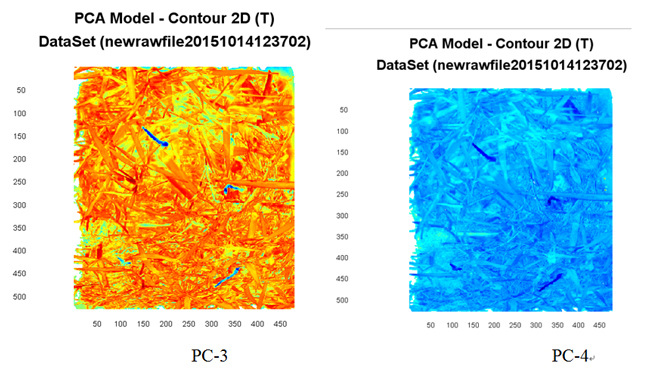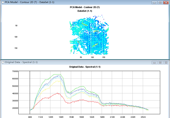 對扣除背景后的原始數(shù)據(jù)進(jìn)行主成分分析(PCA),因高光譜圖像的各個波段之間經(jīng)常是高度相關(guān)的,它們的DN值以及顯示出來的視覺效果往往很相似。主成分分析能夠去除波段之間的多余信息、將波段的圖像信息壓縮到比原波段更為有效的少數(shù)幾個轉(zhuǎn)換波段的方法。