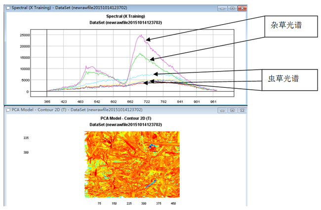而其他雜草的光譜曲線起始和蟲草的很相似,這是因為在400nm-1000nm波段和在1000-2500nm波段,雜草和蟲草都表現(xiàn)出來植被的特征光譜信息。