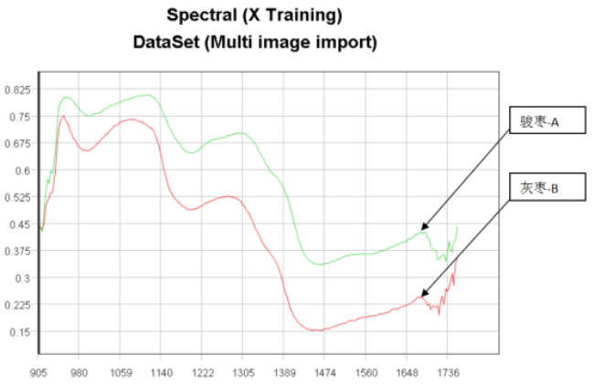 獲取灰棗和駿棗的特征光譜,可以看出,兩種栆的特征光譜位置基本一致,只是其光譜反射率會有一些差別。具體成因還需進一步分析。