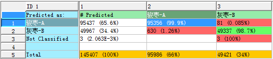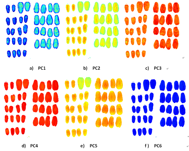 通過獲取感興趣的平均光譜,利用(SIMCA)分類法建立識別模型,對樣本進行分類。預測駿棗-A所占比例為65.6%,灰棗-B所占比例為34.4%。