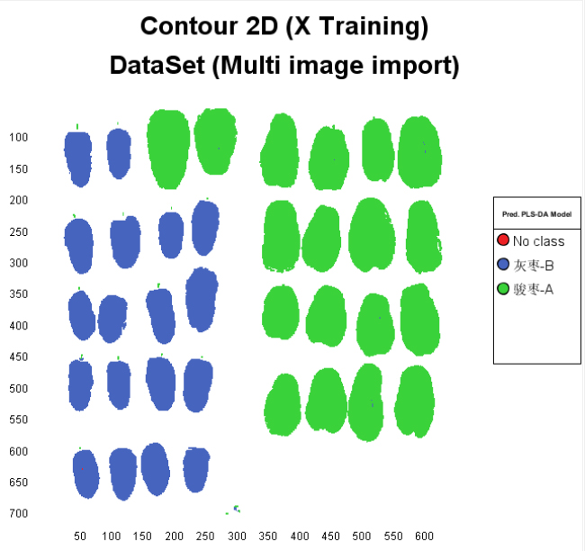 分別選取樣本上的兩個區(qū)域標注為駿棗-A和灰棗-B,以此為標樣對其他樣品進行歸類識別。對已經(jīng)劃分出來的類別進行PLS-DA算法處理,評估劃分出來類別成分。