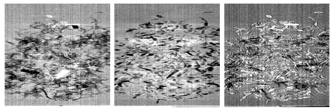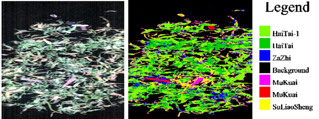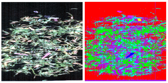 圖7為決策樹的分叉圖,主要運(yùn)用了MNF變化的MNF2、3、4、5波段,以及高光譜圖像數(shù)據(jù)的第15、80、104波段做決策樹分類,該閾值是運(yùn)用最大類間方差法獲取。圖8為利用該決策樹的分類效果圖,從圖中可知,原圖無法用肉眼識別的塑料繩、雜質(zhì)等,運(yùn)用決策樹分類后能較為清晰的識別出來,而且圖像處理速度大大提高。