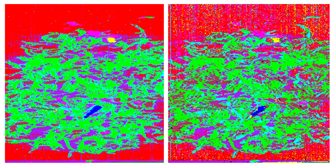 高光譜遙感圖像分類是高光譜遙感圖像分析和應(yīng)用的重要內(nèi)容,根據(jù)是否使用類別的先驗(yàn)知識,可分為監(jiān)督分類和非監(jiān)督分類,常用的監(jiān)督分類方法有最大似然分類法、光譜匹配法和神經(jīng)網(wǎng)絡(luò)法等,非監(jiān)督分類常用的方法有K-Means和ISODATA法。本研究運(yùn)用監(jiān)督分類方法中的最大似然分類法、神經(jīng)網(wǎng)絡(luò)法、光譜角匹配法來研究海苔、雜質(zhì)、背景的區(qū)分,分類結(jié)果如圖6所示。圖6中綠色和紫色為海苔,紅色為背景,其他顏色為雜質(zhì)。從圖6所知,這三種監(jiān)督分類方法中,神經(jīng)網(wǎng)絡(luò)的分類效果最好,能識別出幾種不同雜質(zhì),然而塑料繩并未清晰的識別出來,而且神經(jīng)網(wǎng)絡(luò)分類方法分類速度較慢,需要選擇訓(xùn)練樣本,費(fèi)時(shí)費(fèi)力,不利于產(chǎn)業(yè)化的應(yīng)用。